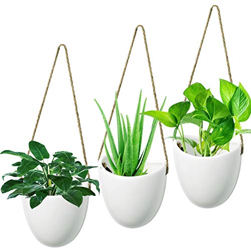 - 🌷 【Cerámica esmaltada de alta calidad】Macetas de cerámica blanca de alta calidad, la cuerda para colgar está hecha de cuerda de cáñamo, muy hermosa y resistente. El juego de macetas es perfecto para exhibir sus amadas plantas, como cactus, hierbas, suculentas, plantas artificiales u otras plantas pequeñas.