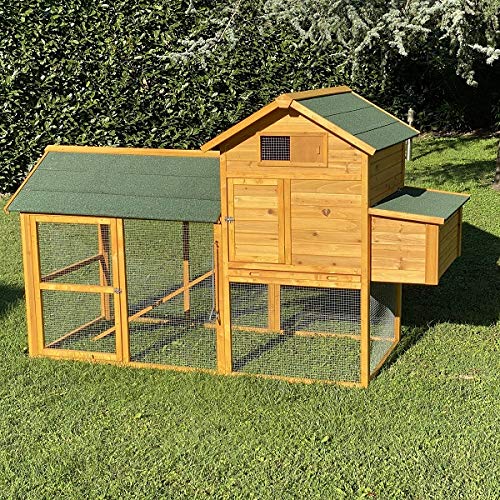 - ✅TECHO ASFÁLTICO Y BANDEJA EXTRAÍBLE: Techo asfáltico y estructura de madera de abeto tratada para resistir a la intemperie. Perfecto para que tus gallinas dispongan de un espacio adecuado para ellas y además seguro. La bandeja extraíble facilita la limpieza del gallinero.